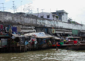 We next took a public ferry to the end of the river line at Northaburi. Then we climbed into a long-tail boat (named from its extra long propeller shaft extending beyond the stern) and for the next few hours we motored the canals through suburban neighborhoods of Bangkok. People were using the water for bathing and swimming. There was a constant stream of vendors in boats moving along the river selling groceries, cooked food and supplies.