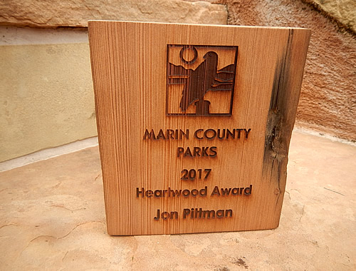 In mid-January, Marin County Parks and Open Space District held their annual volunteer recognition picnic at McNear Beach. It is usually held in September or October but was delayed this year because of the North Bay fires. Jon was awared the Heartwood award for his service as patrol volunteer. He got a certificate in October, and the actual award, constructed from old fenceposts found in the Deer Island Open Space preserve.