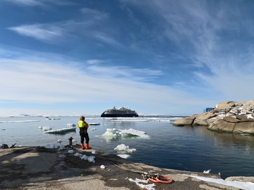 This started off as a quiet morning at sea. After lunch, the ship embedded in the pack ice - about 3-4' thick with a couple of feet of snow. I was talking with one of the officers on the bridge and noticed that he was keeping power on the engines to hold us in place in the ice. Our expedition leaders went out to test the ice and deemed it safe for us to go out and explore. I initially tried cross country skis but found them too difficult (it has been about 30 years since I XC skiied), so I switched to snow shoes. I was walking along a well-worn track when my snow shoe plunged through the snow crust and landed on the ice. A pain to get out, but not impossible. But then, the ice below me gave way and I plunged into the water. I called for help from guests nearby. One woman came to my aid but the ice started breaking up around her. She summoned more help and other guests arrived who helped pull me out of the water with my ski poles. I was in the water for 5-10 minutes. It was very cold but mostly I was focused on problem solving to get out. I was wearing a 360 go pro and captured the whole thing. The video on the left is a 360 video of the whole trek (plunge begins at ~1:20) and the right is a key-framed video of the plunge itself. My camera fell off as I was getting out of the water but someone picked it up and gave it back to me - it was still recording. Our expedition guides later told me that the weak spot in the ice was made by seals chipping at the underside of the ice to make a breathing hole. They awarded me an honorary polar plunge patch. I told them I was the only one to do a polar plunge without signing a liability waiver. Here is the Daily Expedition Report and Care's Rizbee on the Road blog for Coulman Island.